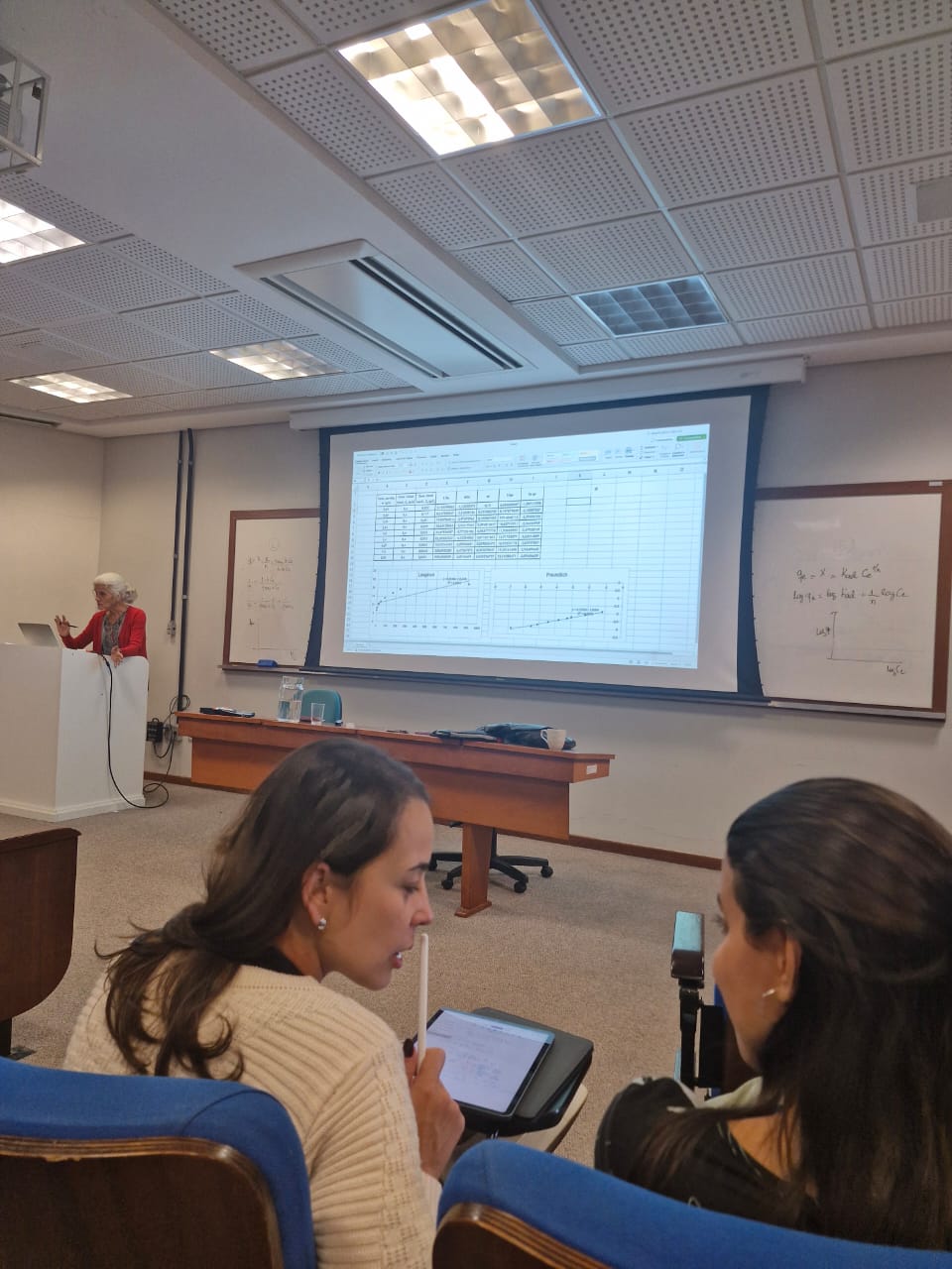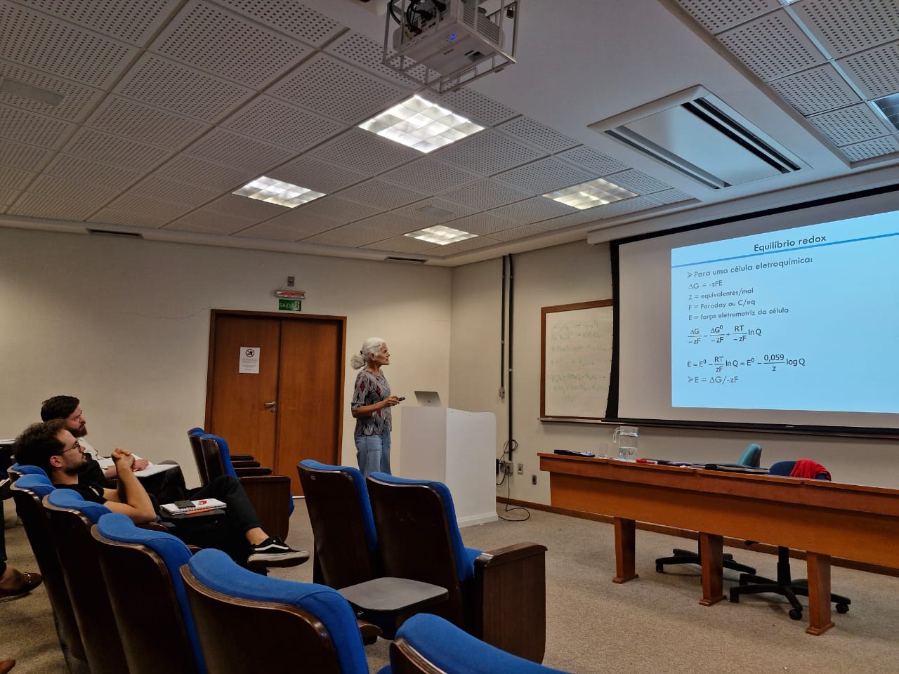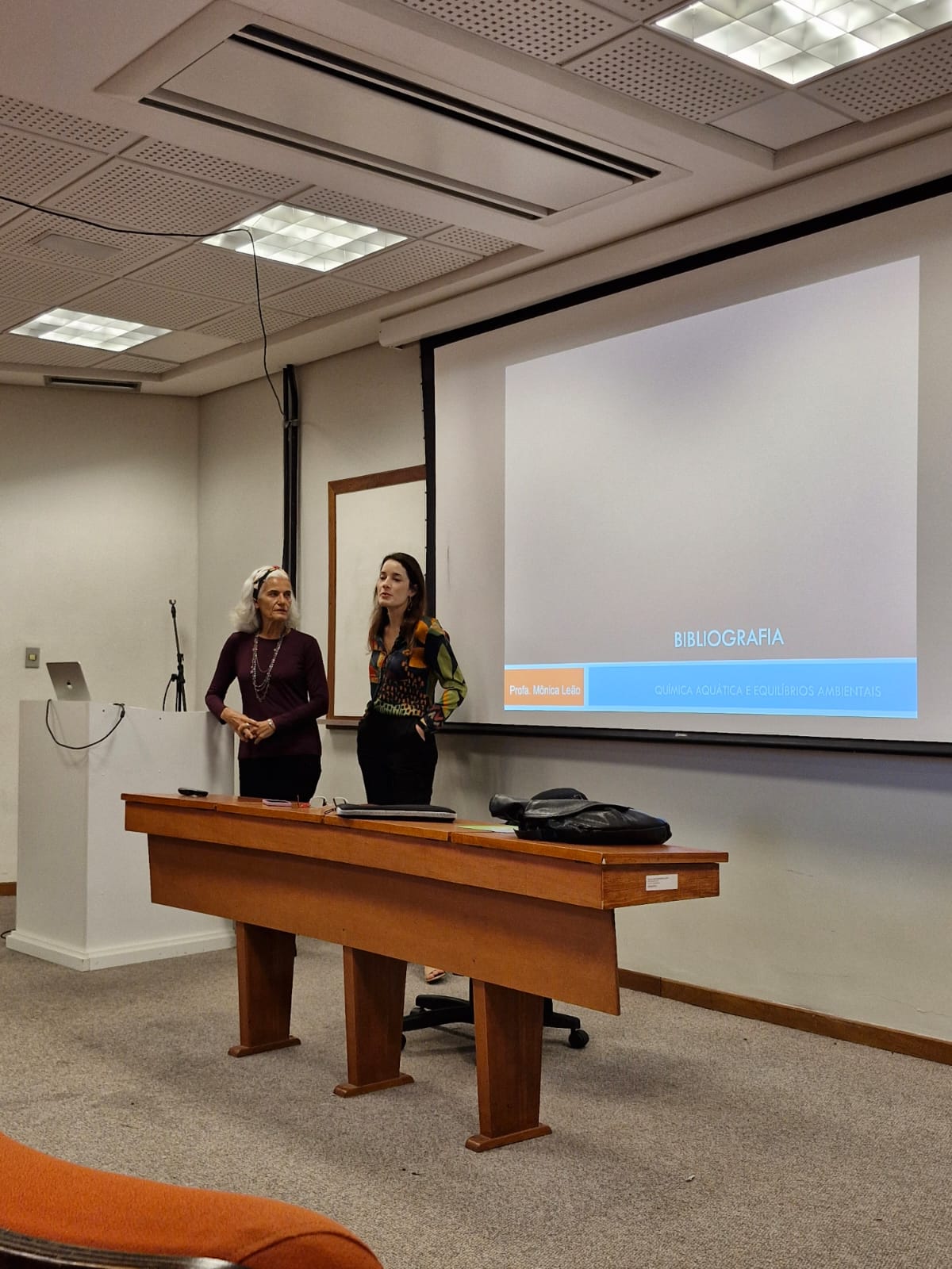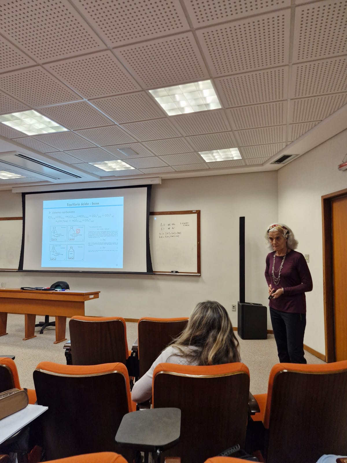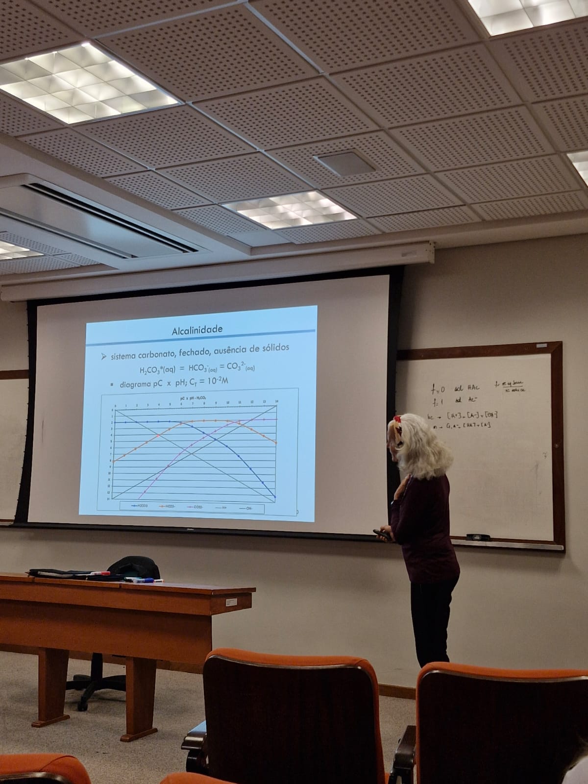 Ao longo dos quatro dias de capacitação, foram abordados temas fundamentais da química aquática, incluindo revisão de química geral, equilíbrios ácido–base, gás–líquido, sólido–líquido e redox, além da circulação e especiação de espécies químicas em sistemas aquáticos. A programação incluiu também a discussão de exercícios, promovendo a integração entre teoria e aplicação prática.