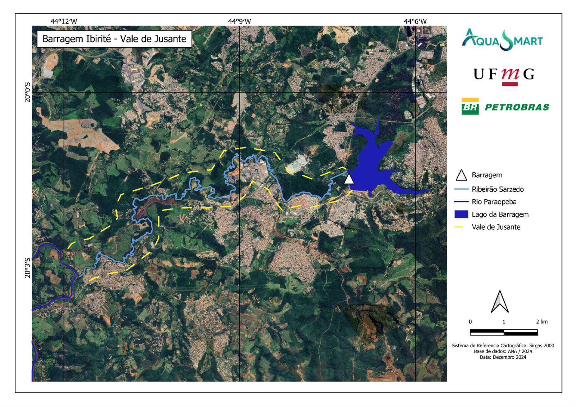A área de estudos do projeto também engloba o vale imediatamente a jusante da barragem de Ibirité, uma vez que a existência do reservatório influencia diretamente na dinâmica das águas que escoam nessa porção do Ribeirão Sarzedo até a sua confluência com o Rio Paraopeba. Os estudos relacionados à essa área têm como principal enfoque a caracterização do risco de inundações, uma vez que a existência da barragem e de seu reservatório acabam por impor um risco tecnológico ao vale a jusante. No entanto, a construção da barragem tem um efeito direto no amortecimento de cheias naturais provenientes da sua bacia de contribuição, reduzindo o risco de inundações. Nesse contexto, o avanço da urbanização nessas áreas susceptíveis a inundações naturais ou tecnológicas também constitui um enorme avanço em termos de aprimoramento de planos e mecanismos que propiciem uma maior resiliência e sustentabilidade para a população exposta a esses riscos.