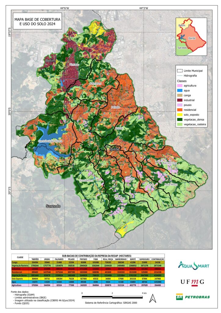 Através de imagens do satélite sino-brasileiro CBERS-4A, foi confeccionado um mapa de uso e cobertura do solo da bacia de Ibirité para o ano de 2023. A partir do mapa é possível compreender a interação que diferentes classes (urbano, solo exposto, vegetação e agricultura) possuem com o atual cenário da lagoa de Ibirité:
